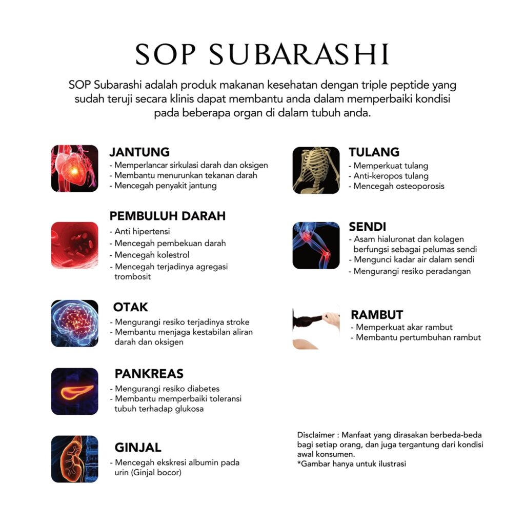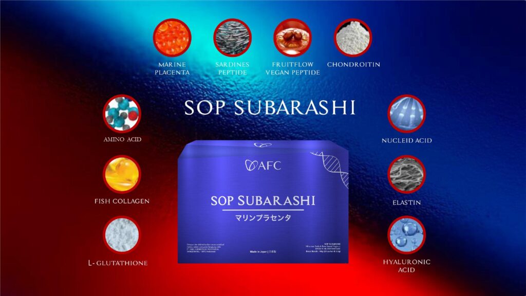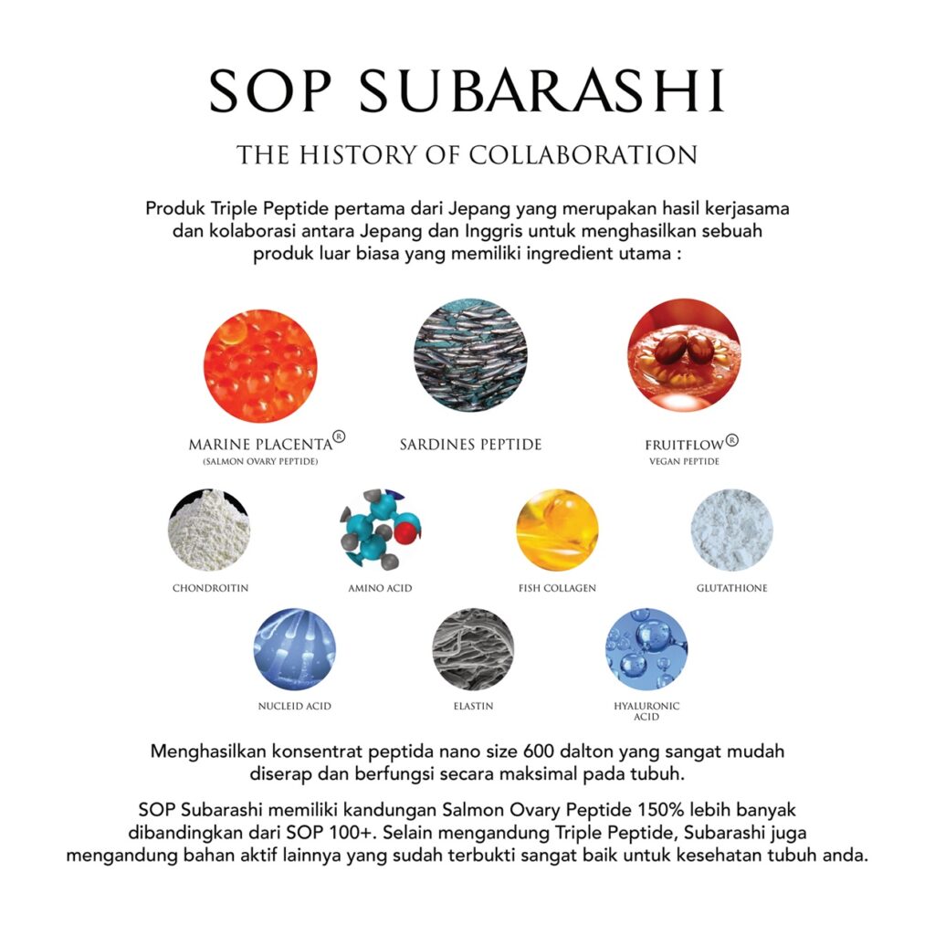 SOP Subarashi merupakan produk triple peptide pertama di Jepang yang memiliki bahan utama yaitu Marine Placenta ikan Onchorhynchus Keta Salmon di Hokkaido, Sardine Peptide dan Fruitflow (vegan peptide).