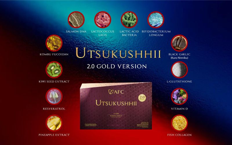 Terbuat dari bahan-bahan alami. 8 Bahan utamanya antara lain : Salmon DNA, Takara Combu Fucoidan, Triple Probiotik, Bawang Hitam, Extrak Nanas, Ekstrak Kulit Anggur, Ektrak Biji Kiwi, Vitamin D dan lain lain. Utsukushhii Gold memiliki 8 paten manfaat seperti yang tertera di bawah ini :